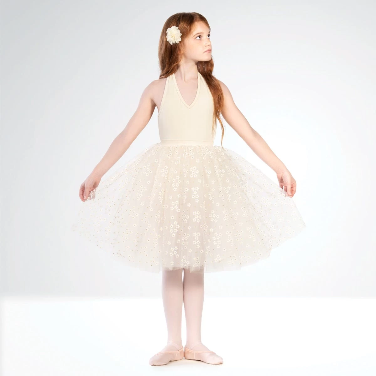 4 layers of flowing tulle skirt with the top layer embellished with daisies offers elegance in abundance for ballet dancers.
