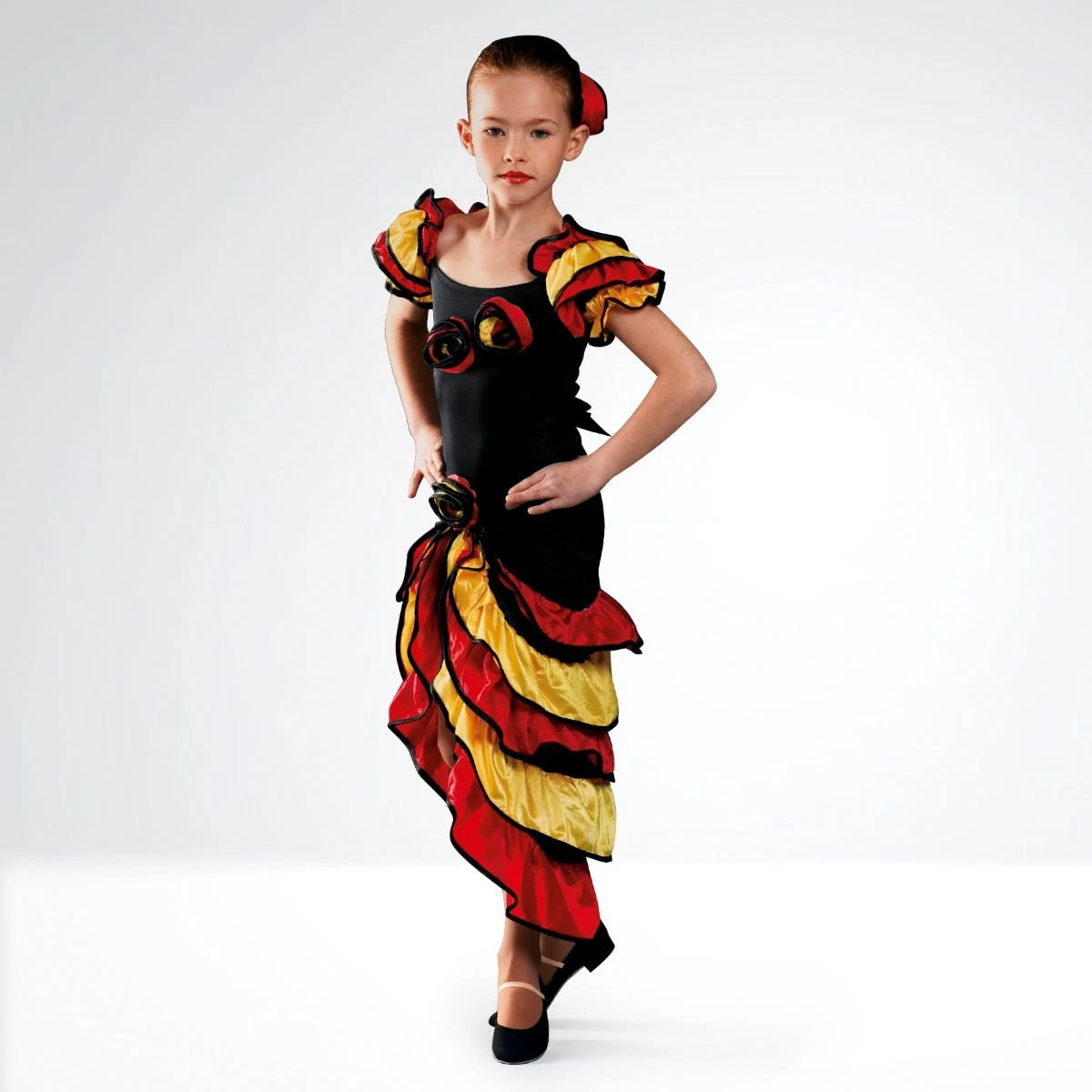 * Black dress featuring 2 attached red/yellow flowers to front, colourful multi frill sleeves and split front with red/yellow multi layer frill & matching flower