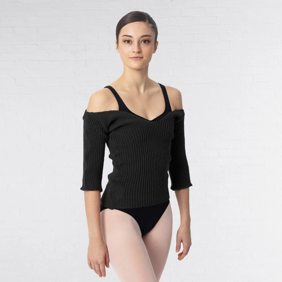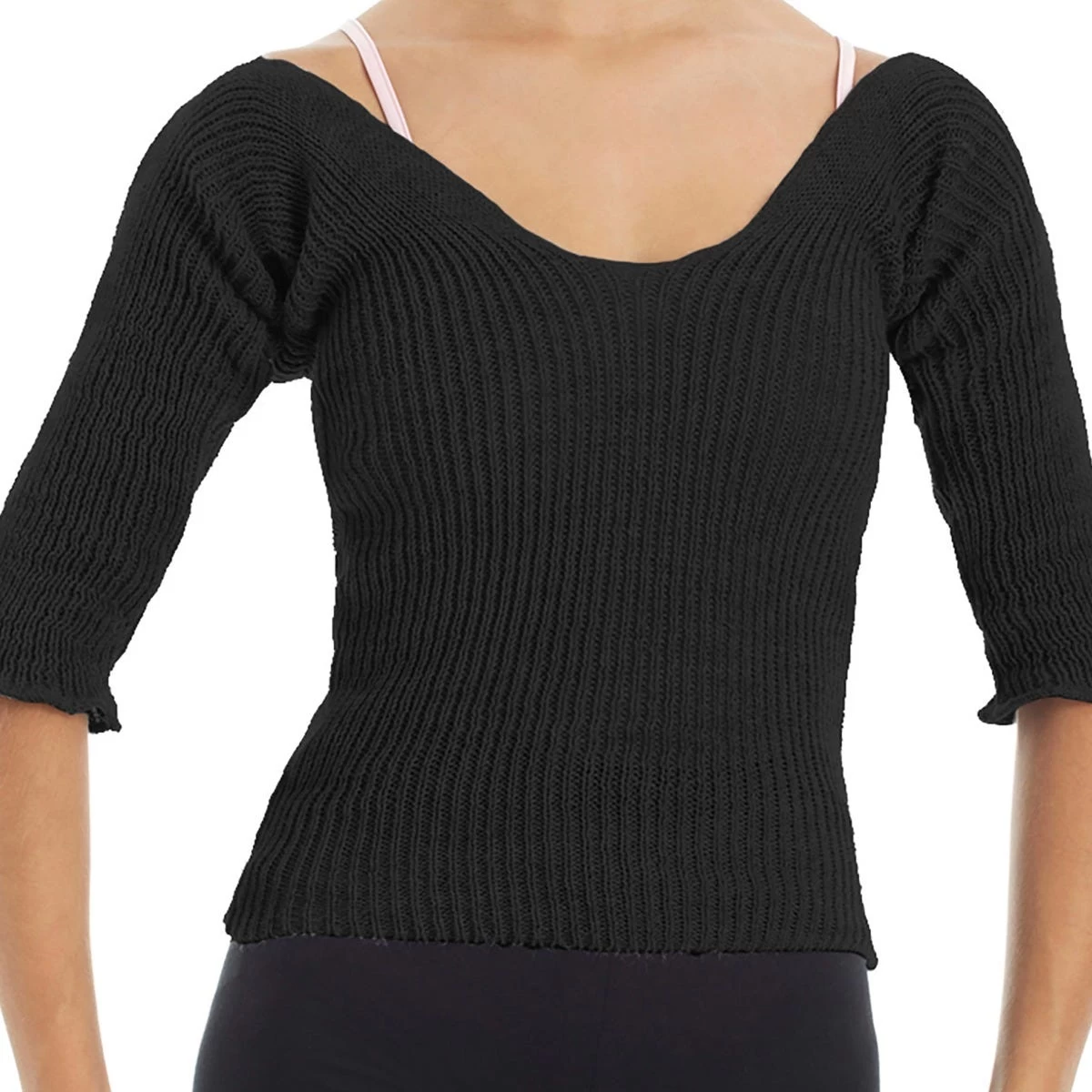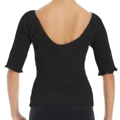 Intermezzo’s quality knitted v-neck snug crop top. This warm up sweater features 3/4 length sleeves, perfect for your warm up routine or to wear casually when it’s cold outside!