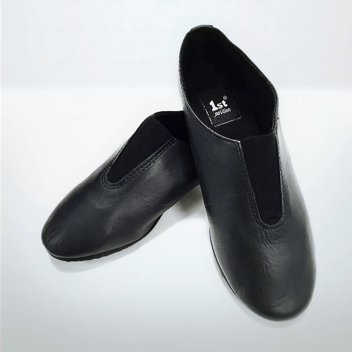 Soft leather jazz shoes from 1st Position with attractive front gusset detail. Elasticated styling makes these jazz shoes comfortable and easy to slip on for dancers of all ages.