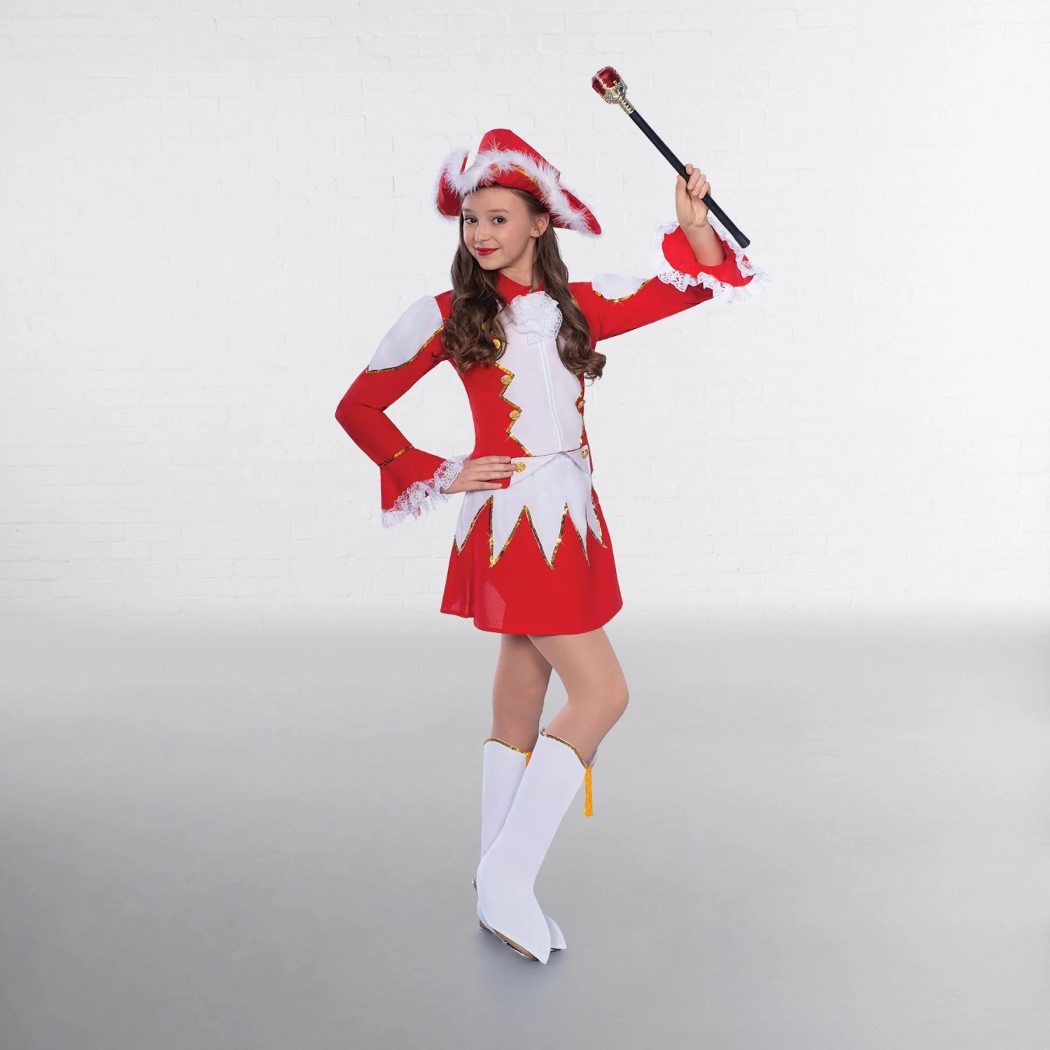 * Costume decorated with stand out gold trim and button detail and attractive lace cuffs