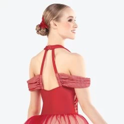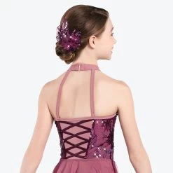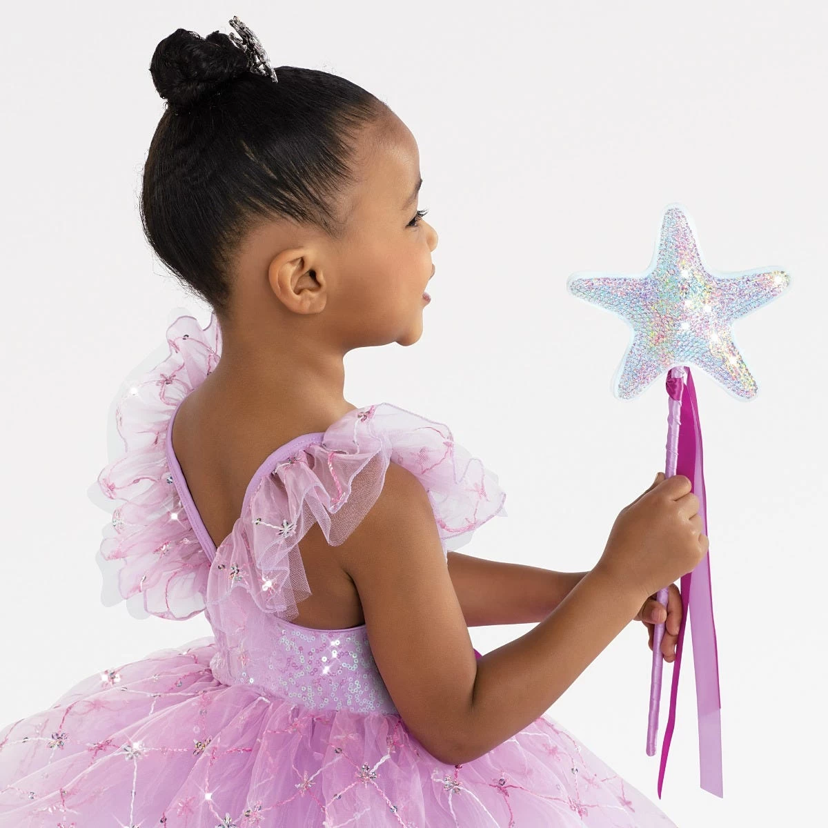 Matte spandex leotard with a sequin spandex overlay has tulle and sequin organza shoulder straps and attached bow at the waist. Skirt is layers of tulle under embroidered sequin organza. Includes mini tiara, wand, hanger and garment bag.