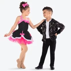 - Attached organdie skirt under a Lycra® and polka dot Lycra® peplum edged in stretch satin trim and bow details