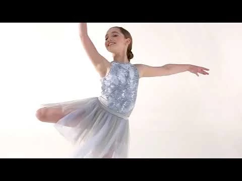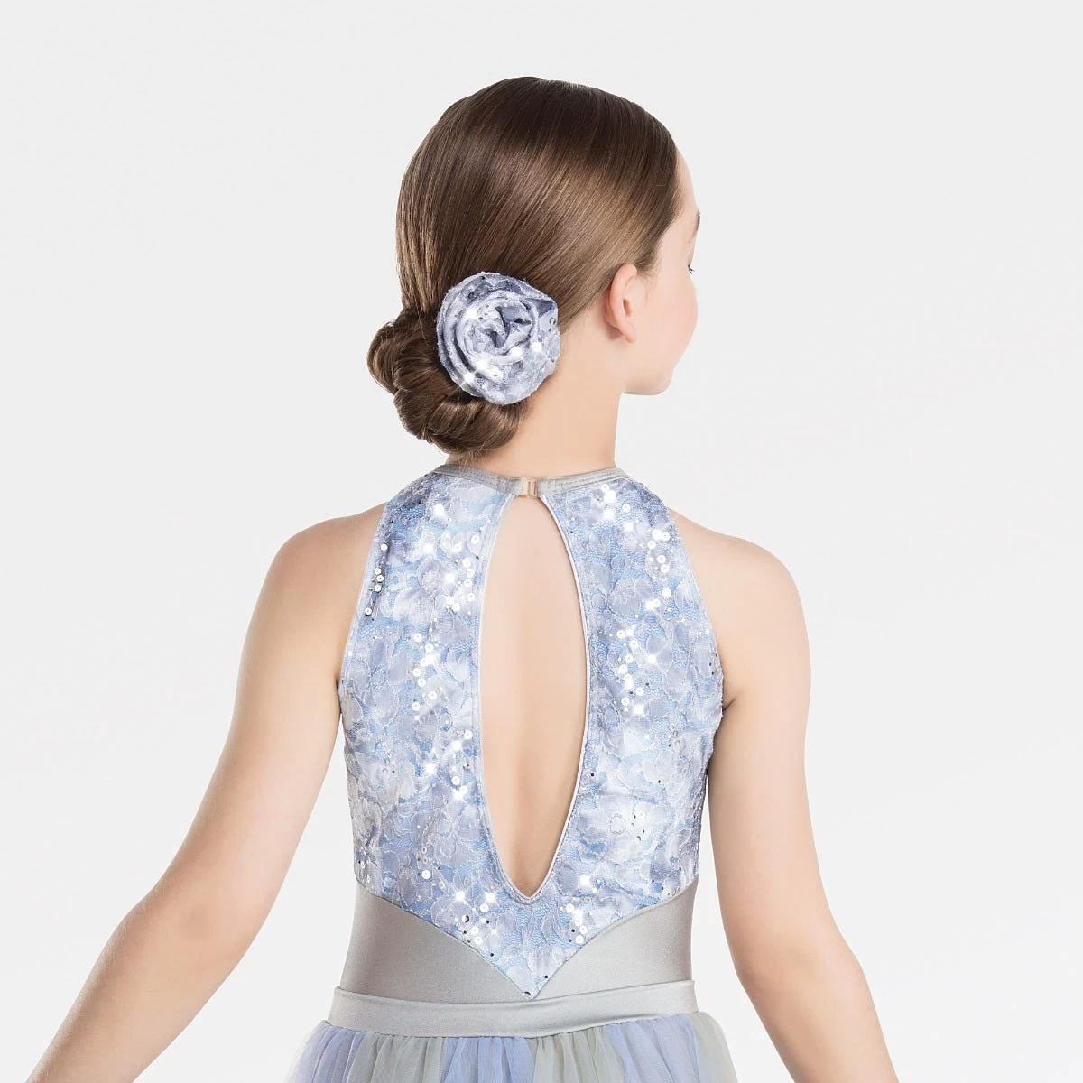* Attached skirt has a chiffon layer of alternating panels of grey and dusty blue chiffon