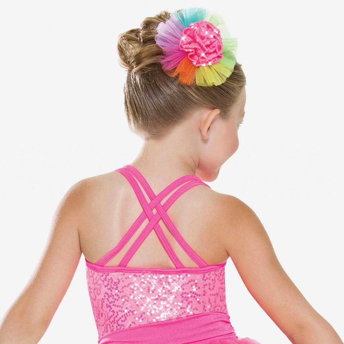 Sunshine, Lollipops and Rainbows – Style RC17119 Sequin spandex leotard is fully-lined and has attached spandex waistband. Attached skirt is layers of organdy in alternating colors. Includes headpiece, bobby pins, organdy flower pin, hanger and garment bag.